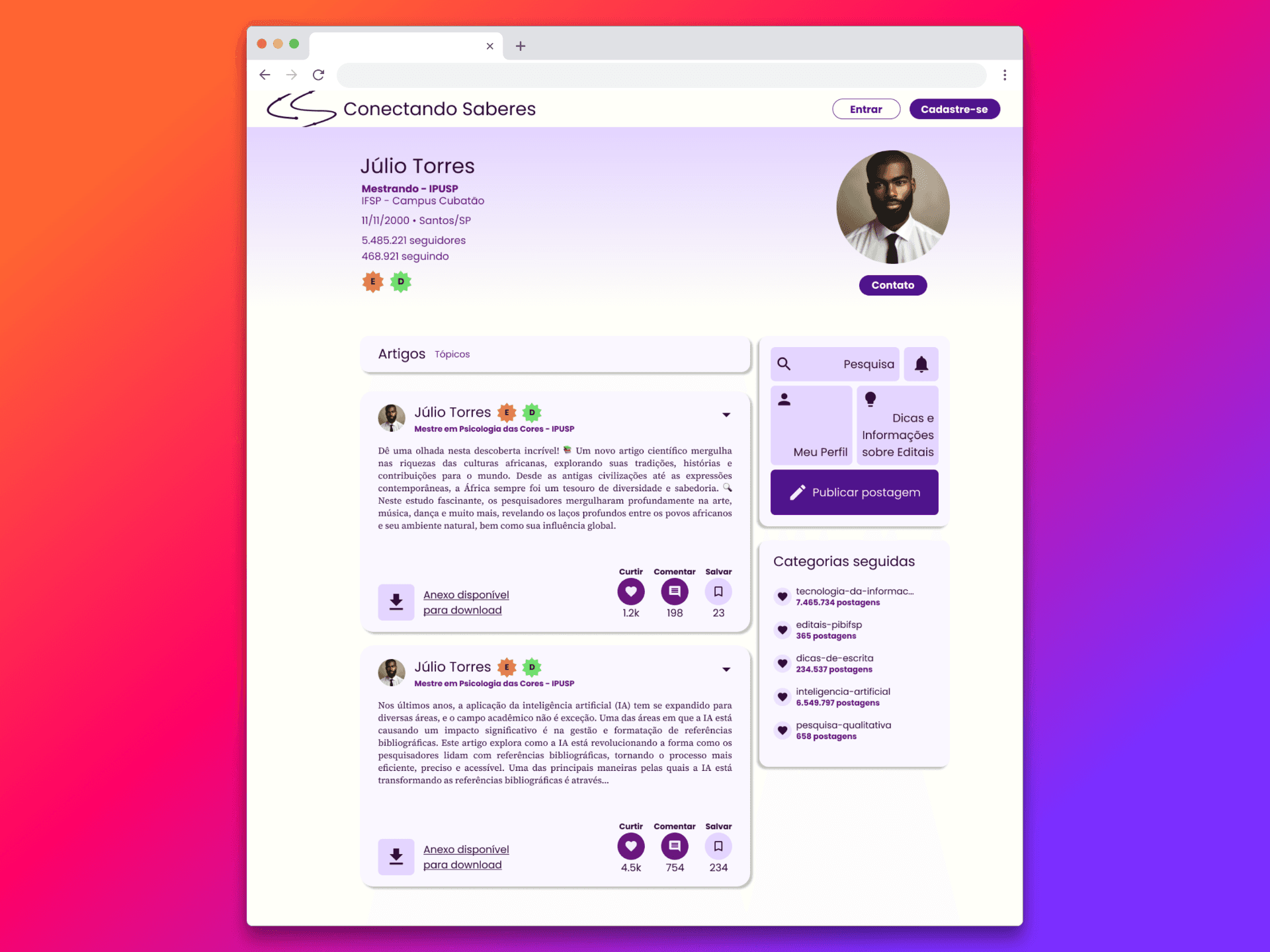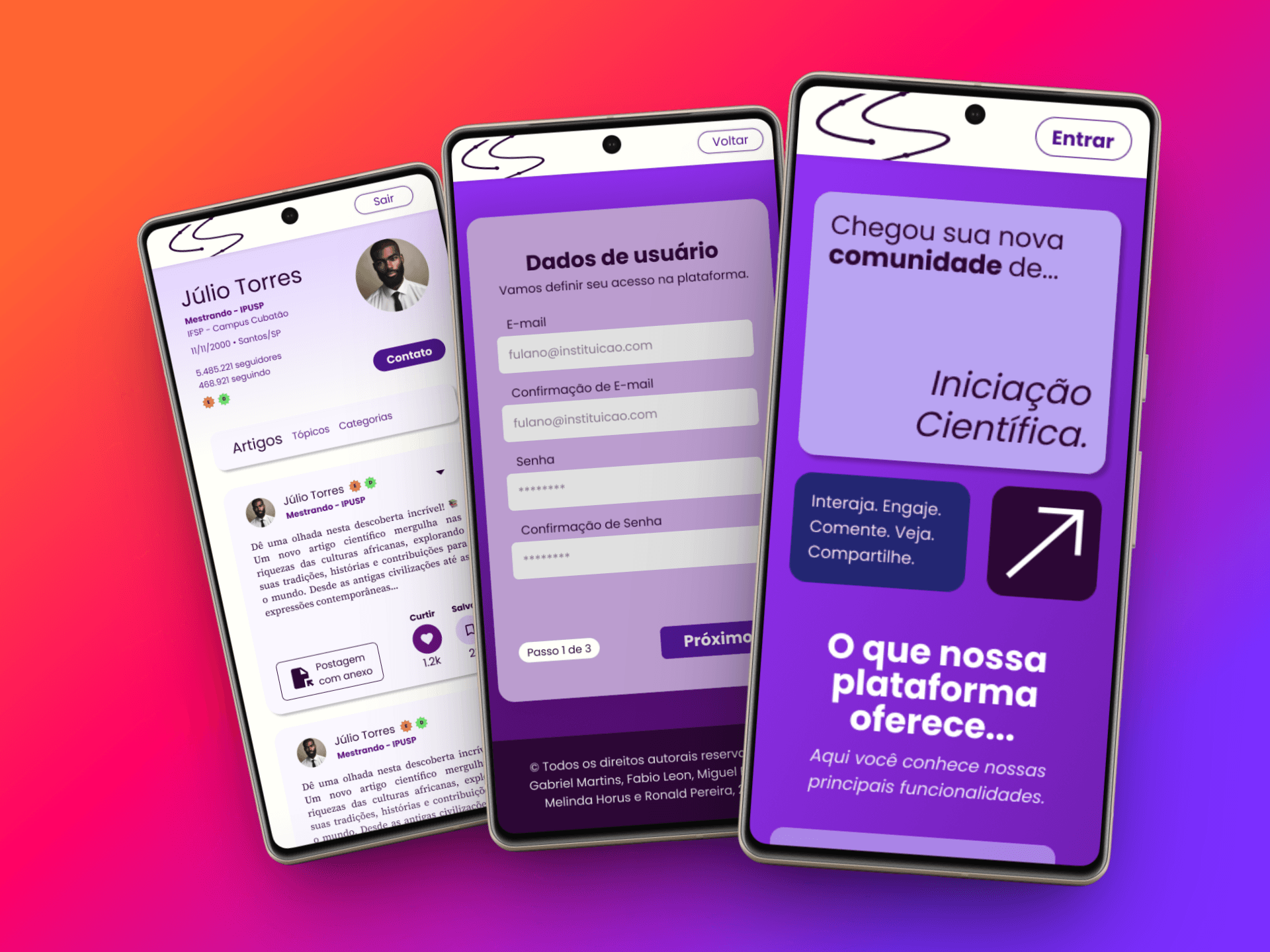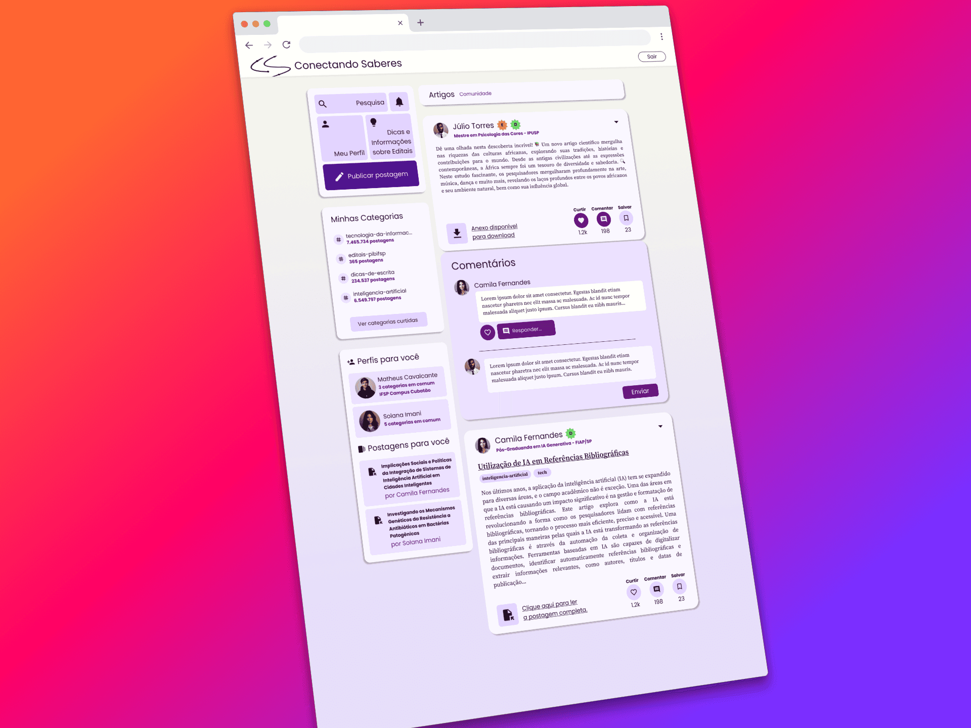 Trabalho de conclusão de curso do curso de Análise e Desenvolvimento de Sistemas no IFSP Campus Cubatão, idealizado por mim e desenvolvido em grupo. O projeto foi realizado em 2024, por 4 estudantes, sendo as minhas competências as áreas de UX/UI Design e desenvolvimento front-end, tendo como foco, criar uma plataforma onde estudantes pudessem ter informações sobre iniciação científica, buscar referências bibliográficas e compartilhar suas experiências na modalidade de pesquisa científica.